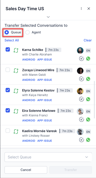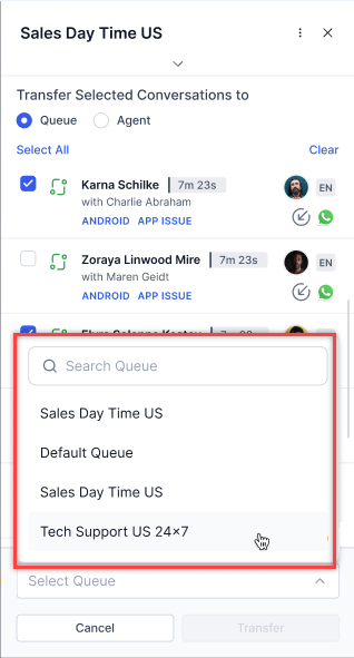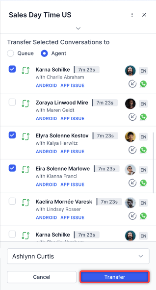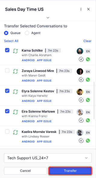 - Select Transfer. The system reassigns the selected conversations to the chosen queue.