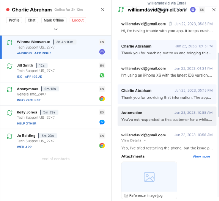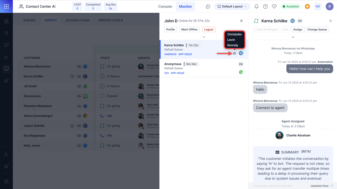 Supervisors can monitor live conversations between agents and customers. The supervisor can view the agent engagement metrics of the agent. At any point, the supervisor can view details of the agent-customer conversation, or the supervisor can manually assign the agent to another available agent.