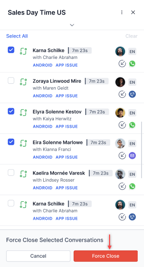 - When a conversation is force-closed—either individually or through a bulk action—a system-generated disposition is automatically attached to the conversation. This behavior applies to both indefinite and timed slot release scenarios.