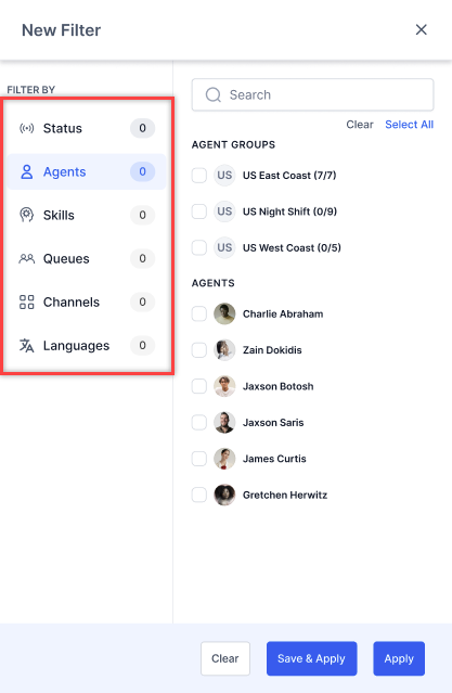You can select from agent groups (list of agents), search for agents, and select from dynamic sub-filters.