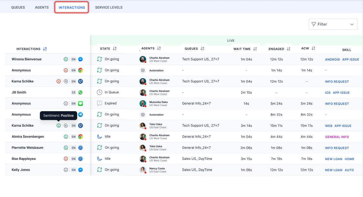 You can view all live interactions on the Contact Center AI console. This view includes only interactions that involve agent transfers. Selecting the sort icon lets you to sort the columns in ascending/descending order. A summary of the interactions view is as follows: