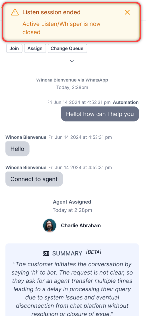 When a supervisor stops listening to a conversation, the message Listen session ended displays.
