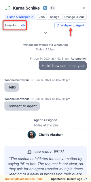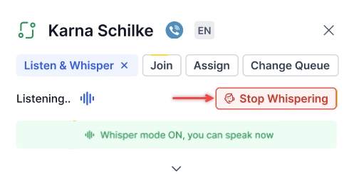 You can listen to the conversation between the customer and the agent. Select Whisper to Agent to whisper to the agent.