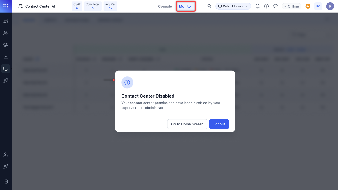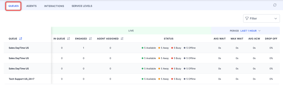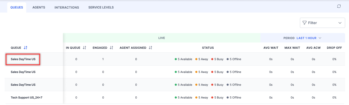 When a supervisor applies a filter, the page refreshes at fixed intervals to verify real-time data accuracy. For example, changes in agent status appear after the auto refresh, keeping the data up to date.