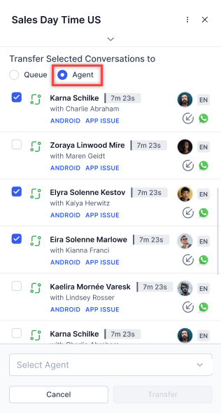 - Selecting Transfer Conversations activates multi-selection mode.
