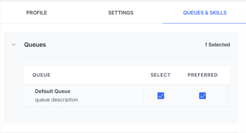 There are three tabs, Profile tab, Settings tab, and Queue & Skills tab.