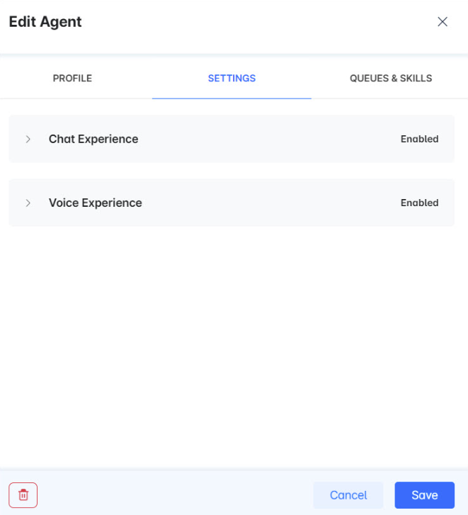 On the Settings tab, you can configure the chat experience and voice experience settings.