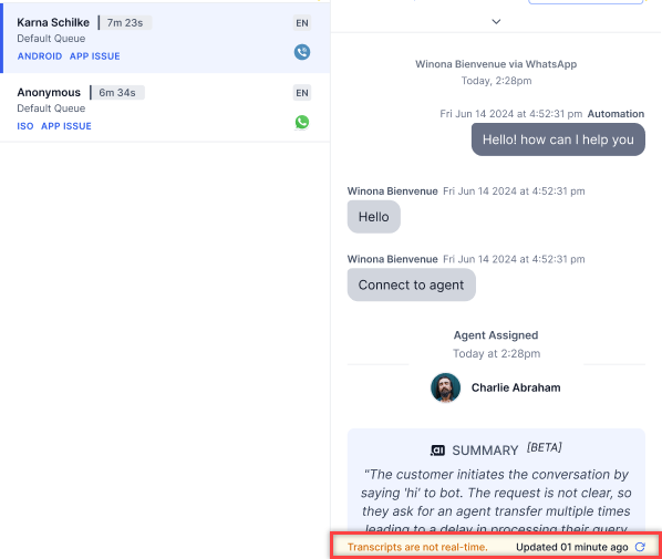 The transcripts aren't real-time. Select the Refresh icon to refresh the transcript.