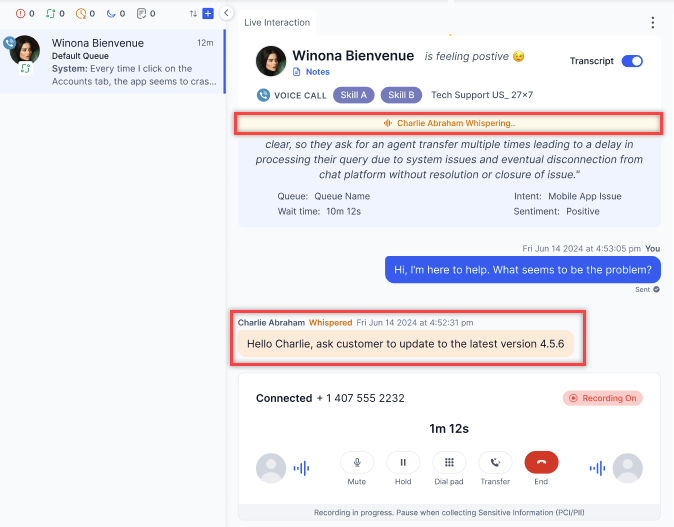When a supervisor whispers, an indication appears at the top of the live interaction, and the transcript displays in yellow.