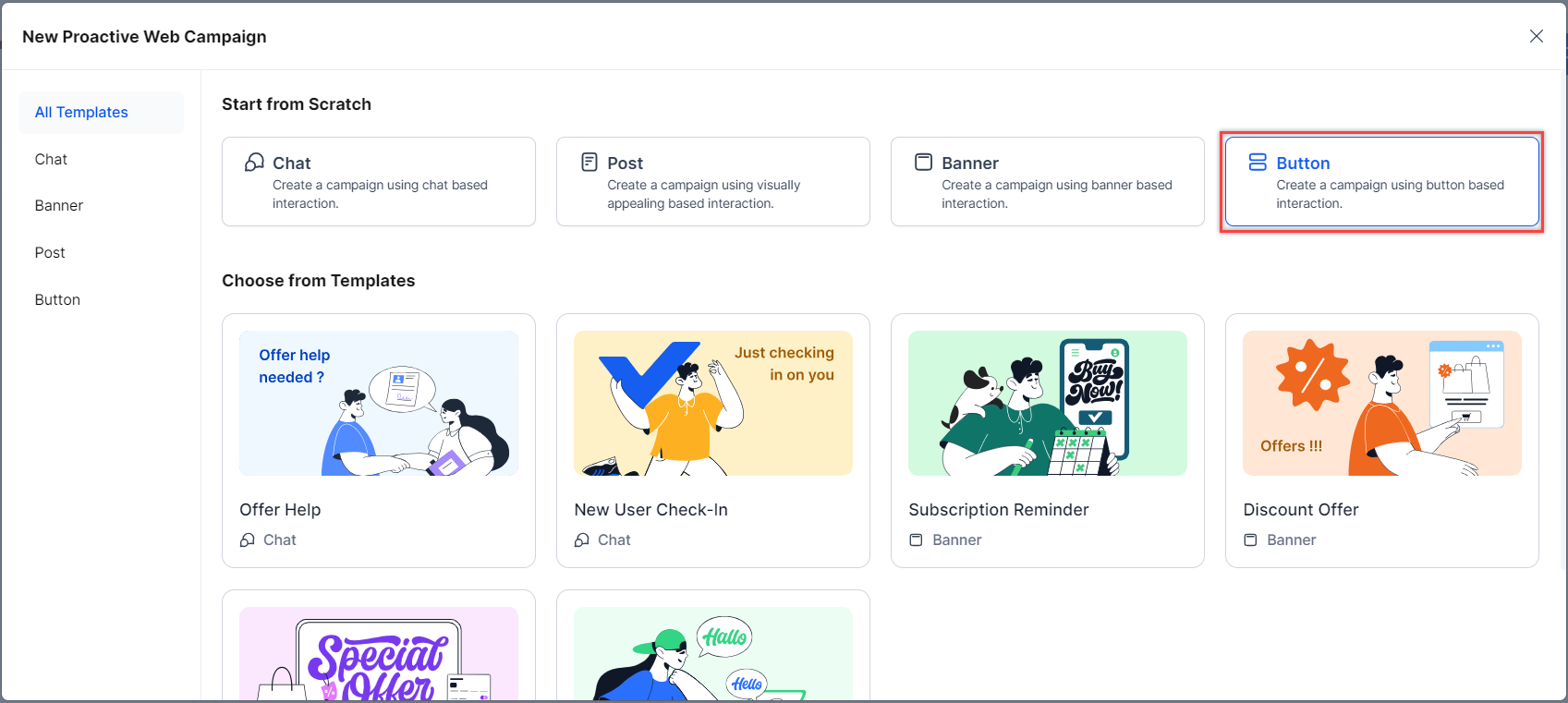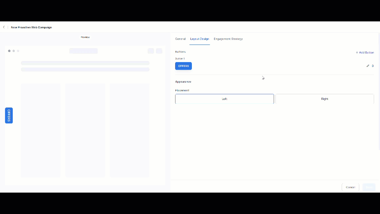 A button appears to the customer on the web page. This button can remain static or trigger based on a customer action, and you can place it on either the right or left side of the web page. |