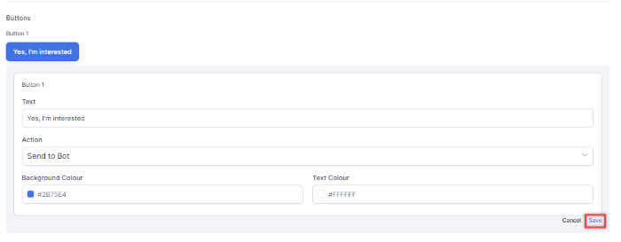 Editicon to edit the details of an existing button. You can enter the Text for the button, select the Action performed on selecting the button, Background Color, Text Color for the button, and selectSave.
