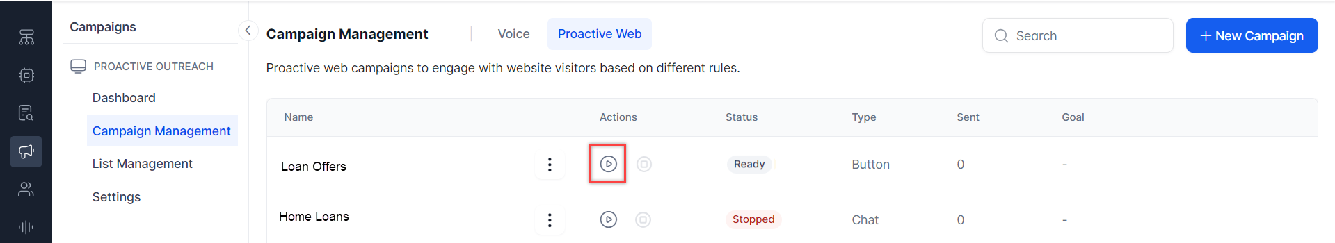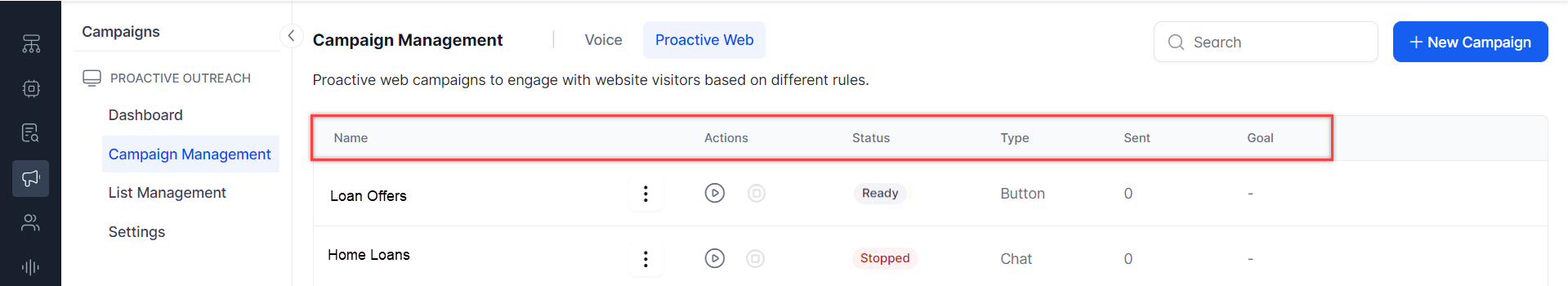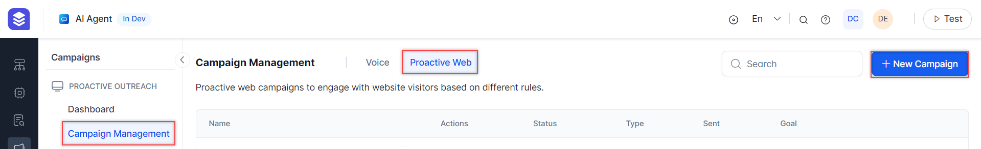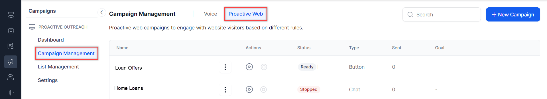 You can access the Proactive Web Campaigns by going to Campaign Management > Proactive Web.