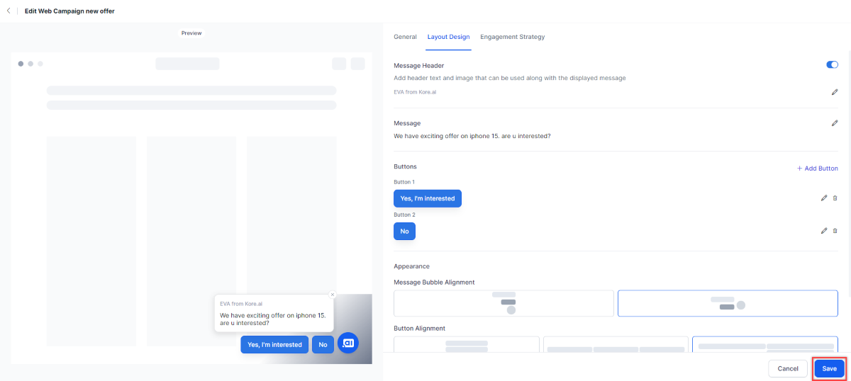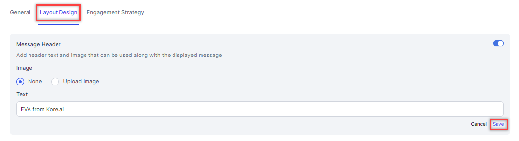 Layout Designtab. Under theMessage Headerselect theEditicon to enter the headerTextandImageused along with the displayed message, and selectSave.
