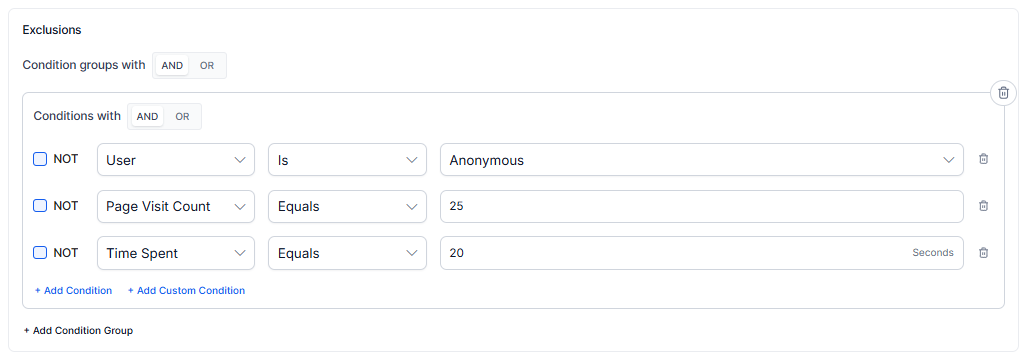 Field Data Type Supported Operators Page Visit CountNumber Equals, Greater Than or Equal To Time SpentNumber Equals UserString Is (known / anonymous) CountryString Is StateString Is CityString Is DeviceString Is (Mobile / Laptop / Tablet) URLString Contains, Ends With Page NameString Is, Contains Hover OnString ID, Class, and Query Selector You can apply the NOT operator at any condition level to invert the condition.