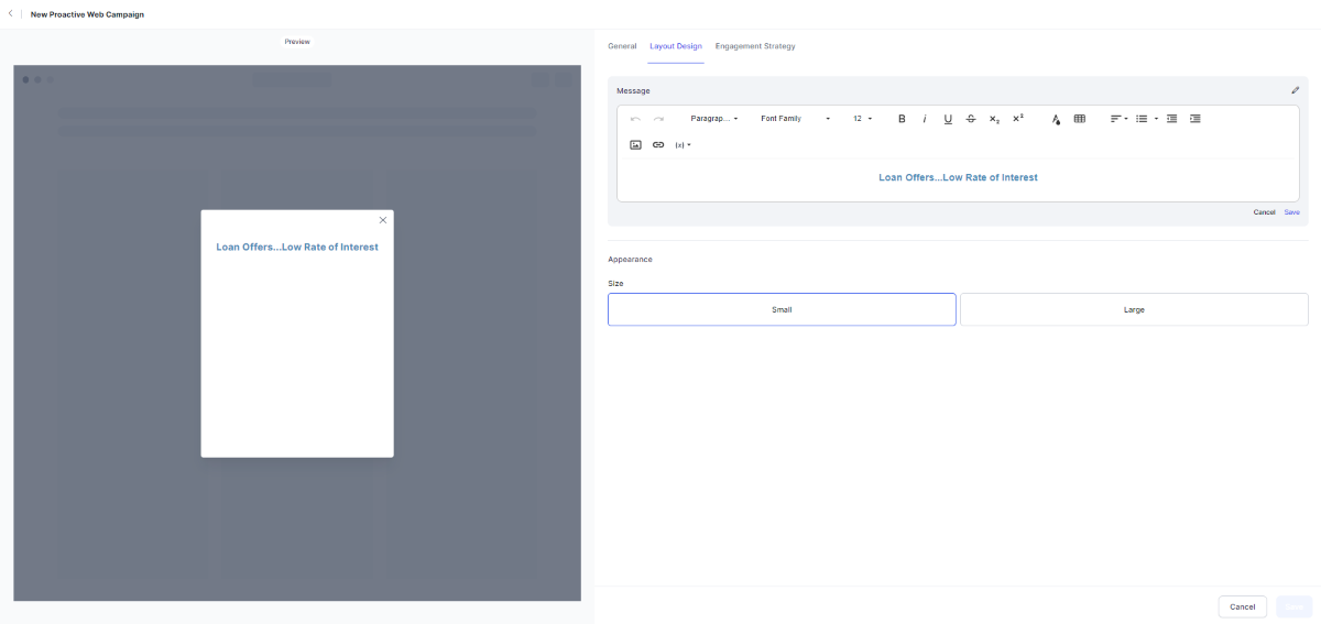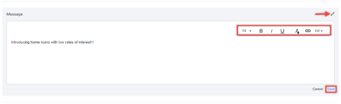 Editicon and enter the message that displays to the website visitor. You can select the font size, make the text bold, italics, underline, select, add links, text color, or add variables, and selectSave.