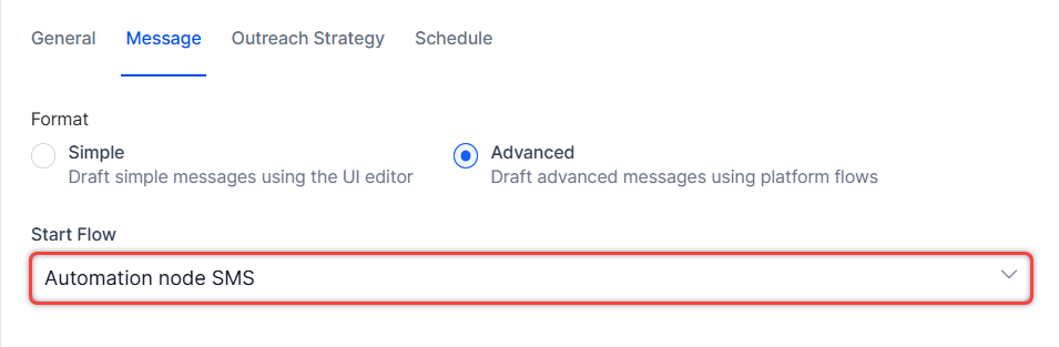 Advanced: This format is useful for two-way messaging (Inbound and Outbound) by linking to a start flow that contains dialog tasks. All the published start flows are displayed regardless of a number associated with them. This format can also be used to transfer to an agent using the attached flow. Select a start flow from the dropdown.
