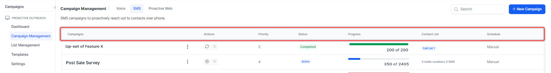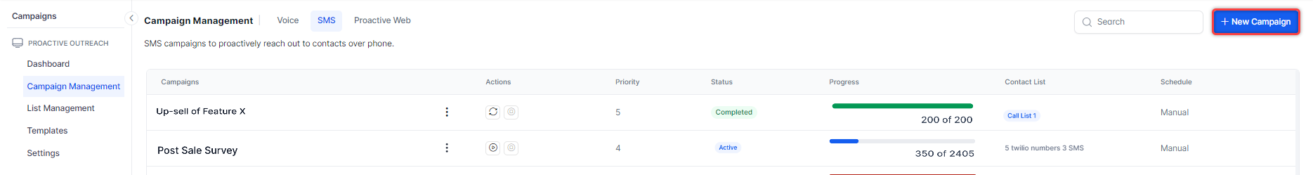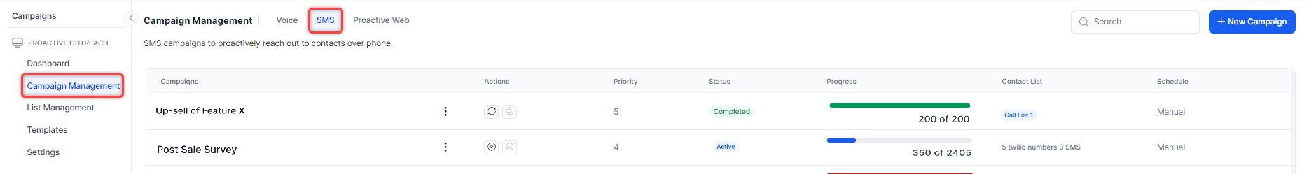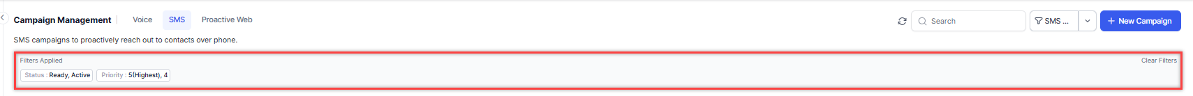 Running an SMS campaign changes the campaign status to Active and sends the configured message to the numbers in the contact lists. Campaigns run based on their configured priority.
