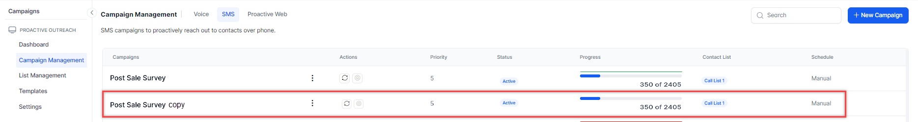 Cloning an SMS campaign creates a replica of the original campaign. This is useful when two or more similar campaigns are run simultaneously.
