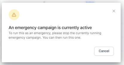 Only one emergency campaign can run per workspace or account. If a user clicks Run as Emergency for another campaign, the system checks for an ongoing emergency campaign and displays a warning if one is in progress.