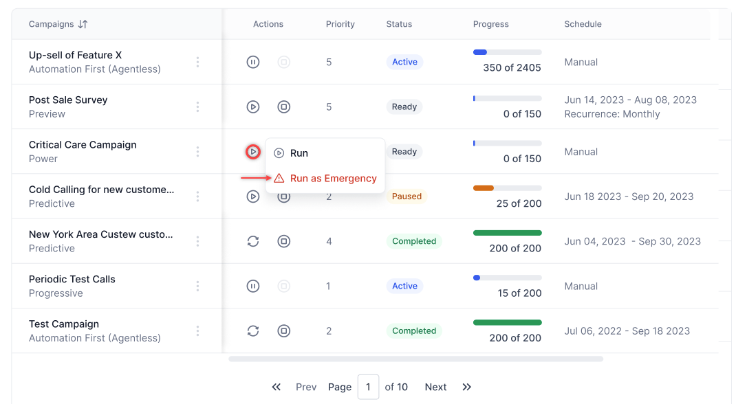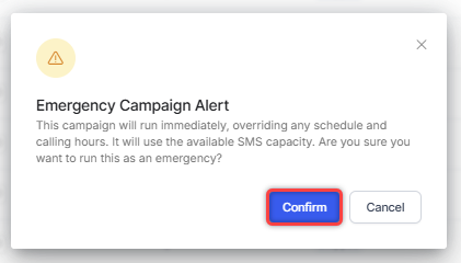 - Run as Emergency: The campaign runs immediately, overriding any schedule and calling hours.