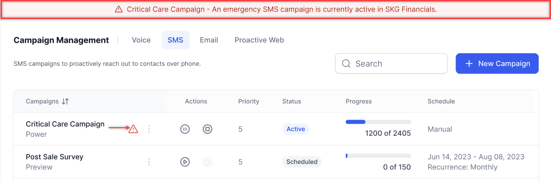 An emergency campaign cannot be paused or resumed; it can only be stopped and rerun. Users can manually stop an active emergency campaign. If rerun, the campaign resumes and completes sending SMS.