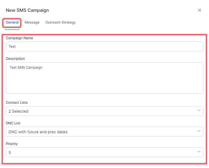The New SMS Campaign dialog box displays. Under the General tab, enter the following details: