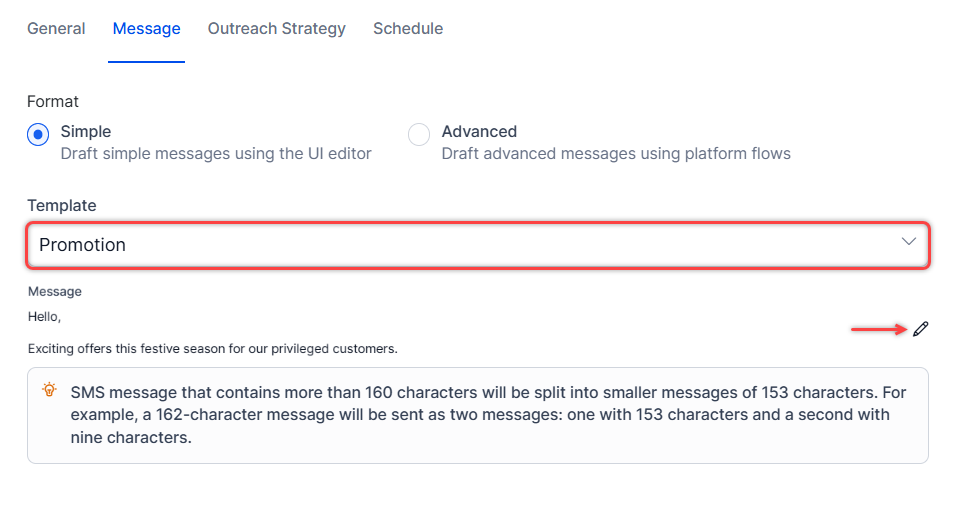 Simple: This format is useful for sending simple outbound messages. Select a template for the SMS campaign from the drop-down. Click the 🖉 icon to enter the message to be shared.