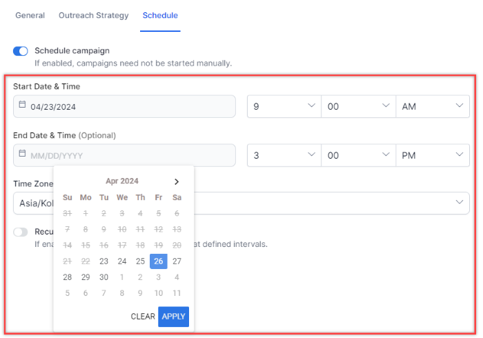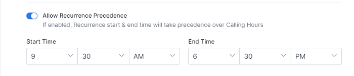 Turning on the Allow Recurrence Precedence toggle gives the recurrence start and end time precedence over Contactable timings. For example, if Contactable Timings are 9:00 AM to 6:00 PM but the user selects Recurrence Start Time as 8:00 AM, the campaign starts contacting from 8:00 AM.