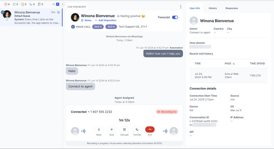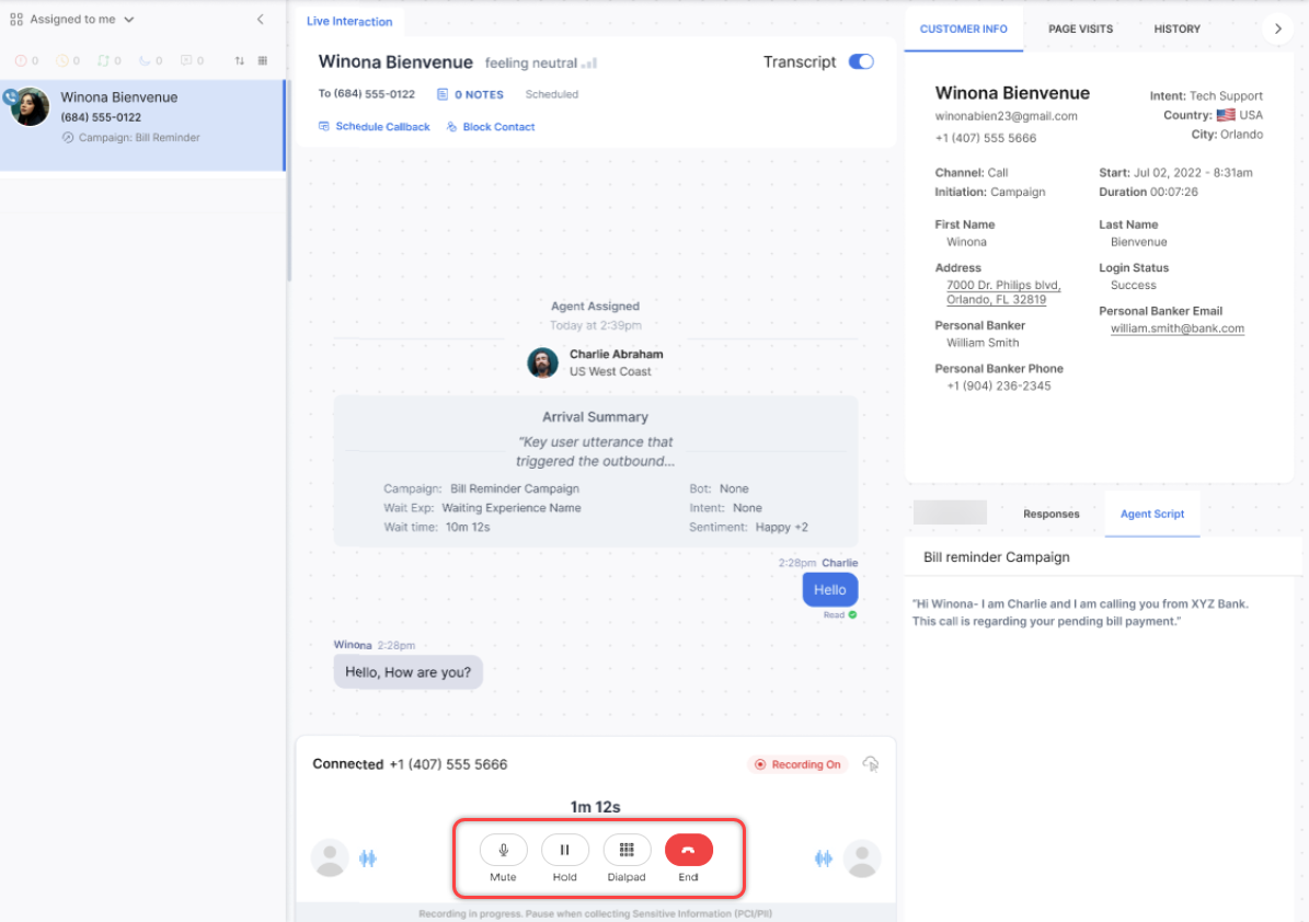 During the call the agent can Mute, place the call on Hold, or end the interaction.