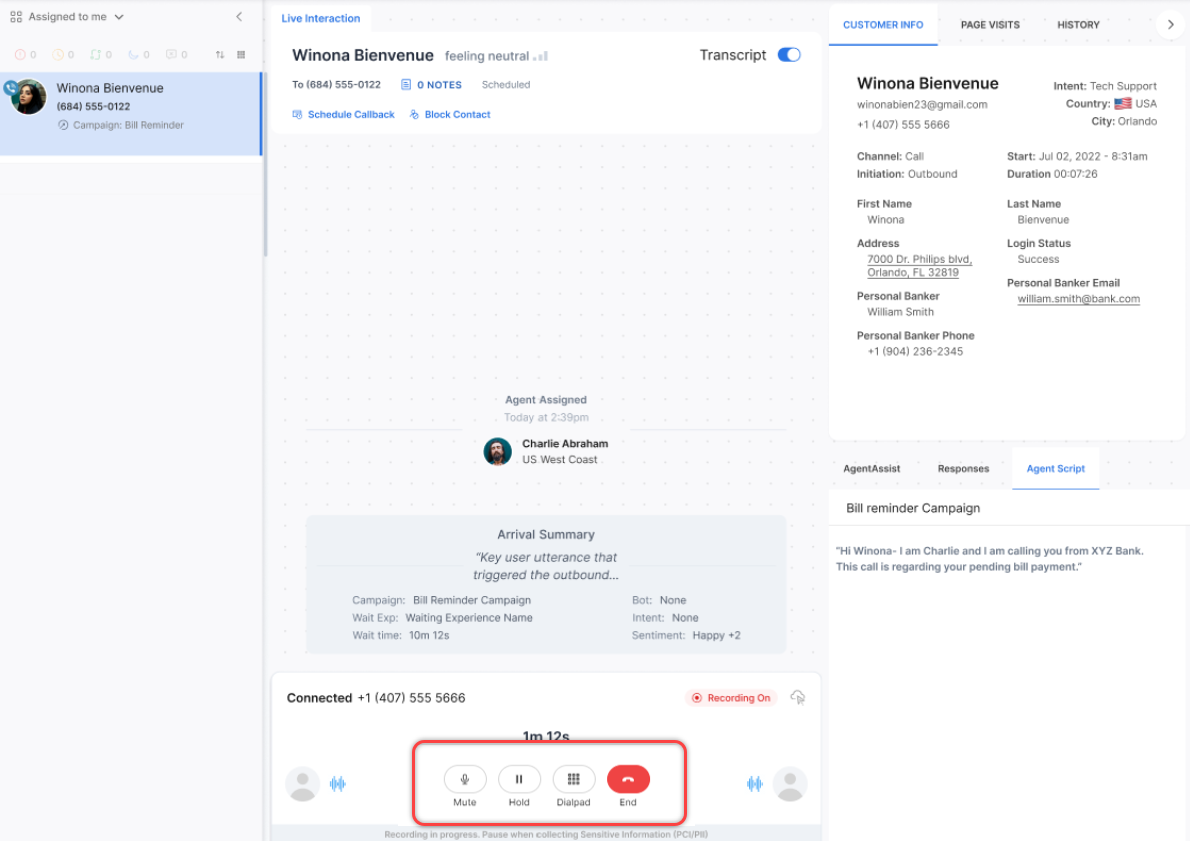 When an agent dials a number, that number becomes unavailable to other agents. When a call is connected, the number isn't dialed again for the duration of the campaign. During the call the agent can Mute, place the call on Hold, or end the interaction. All outbound calls are recorded in the same way as inbound calls to ensure quality and compliance.