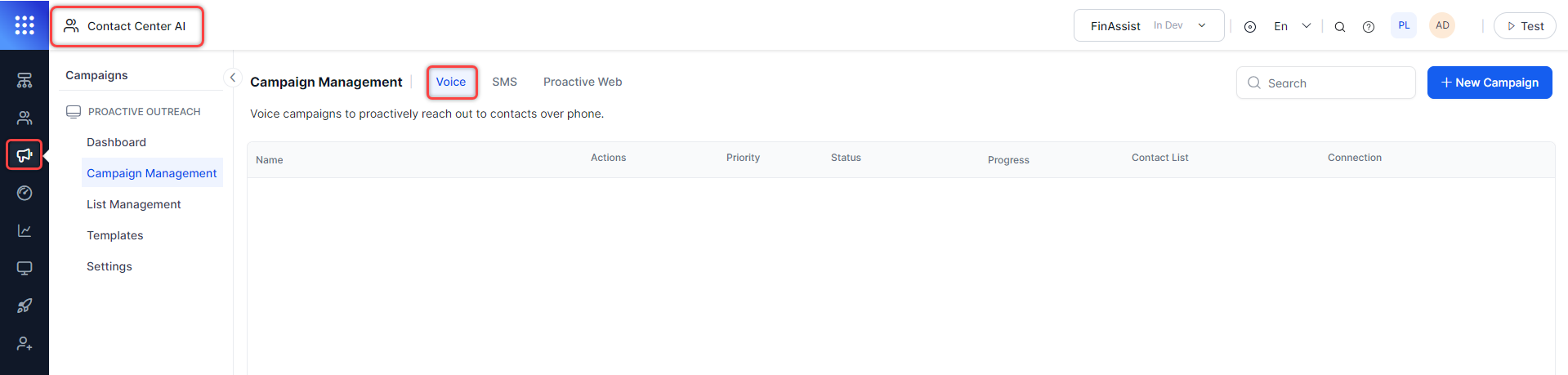 You can access Campaigns by going to Contact Center AI > Campaigns > Proactive Outreach > Campaign Management.
