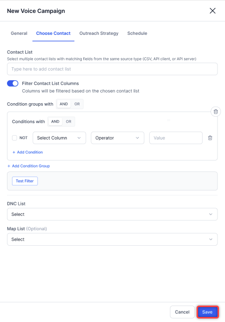 - Turn on the Filter Contact List Columns toggle and configure the filter conditions. The Test Filter option appears when you add dynamic filters, and using it's optional.