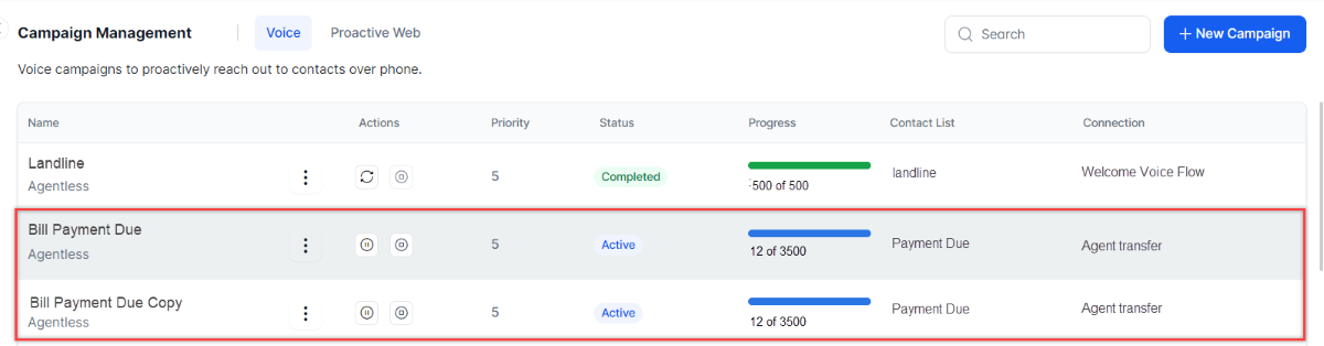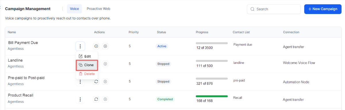 Cloning a voice campaign creates a replica of the original campaign. This is useful when two or more similar campaigns run simultaneously.
