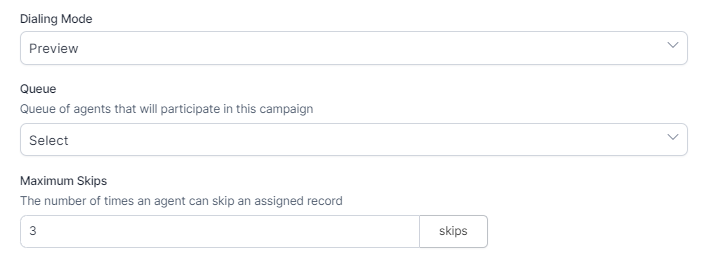 - Enter the Maximum Skips allowed for an assigned record. The skip settings are configured at the campaign level for each campaign the agent is part of.