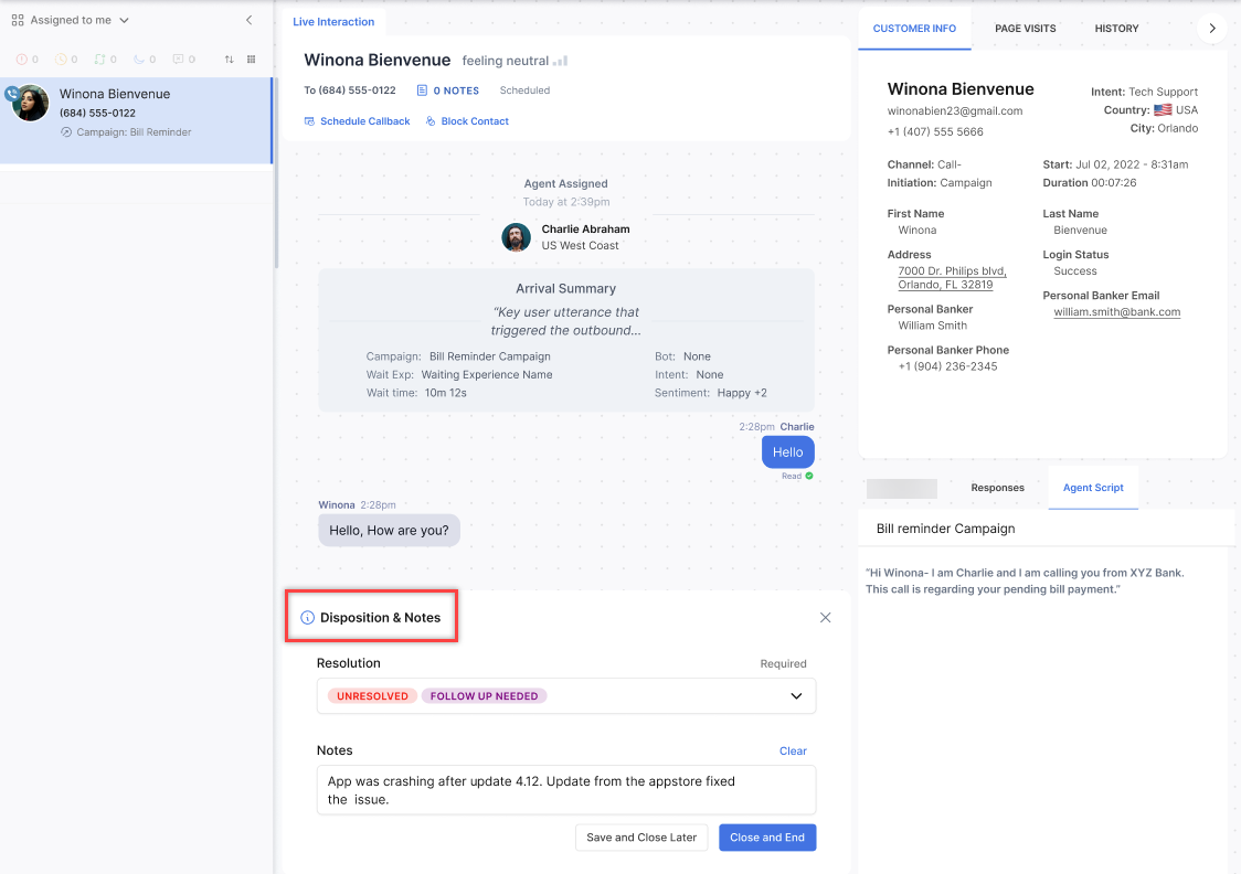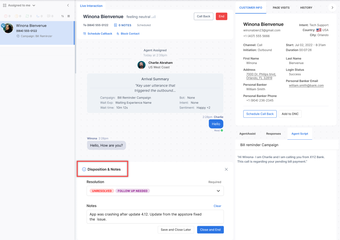 When the dialer selects a contact from the list, it dials the number and upon successful connection with the contact, the interaction is assigned to an agent. The CUSTOMER INFO widget displays the customer's information. the interaction appears on the Conversation Tray along with the campaign name.