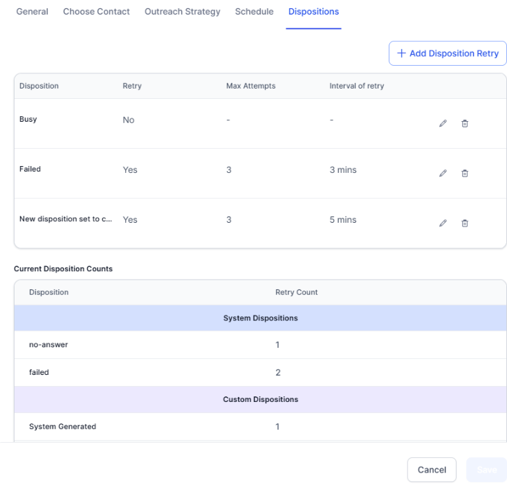 The dispositions tab defines the retry mechanism for dispositions considered as not fully attempted.