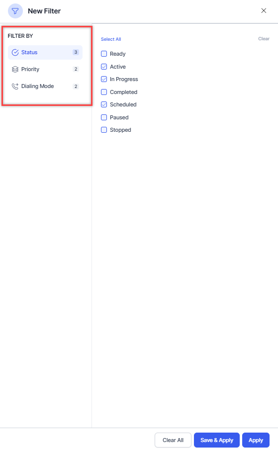 Select the Status, Priority, and Dialing Mode, and choose their respective sub-filters.