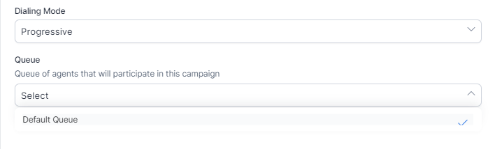 - Progressive dialer - The Queue name selected while creating or editing a campaign. For example, the default Sales Queue.