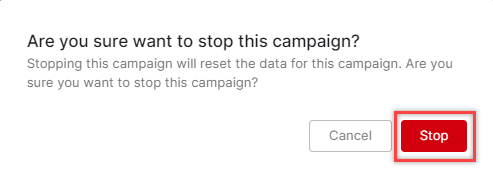 A Stop Campaign confirmation pop-up window appears. Select Stop.