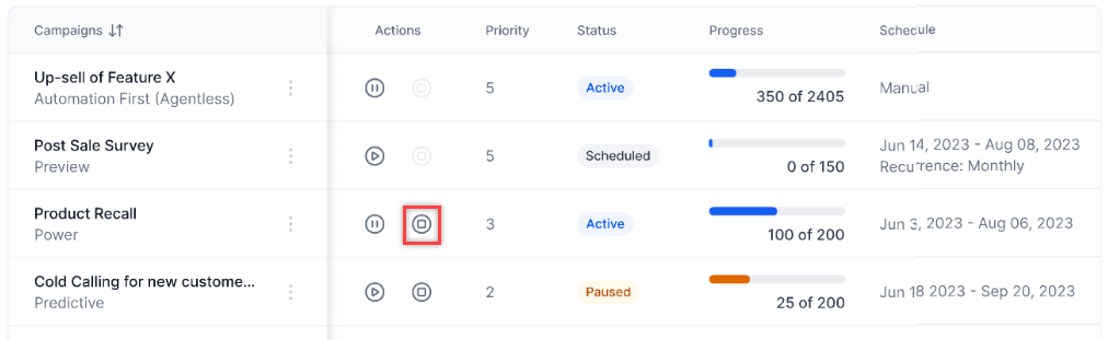 Select Stop under actions. Stopping a scheduled campaign ends the instance of that campaign.