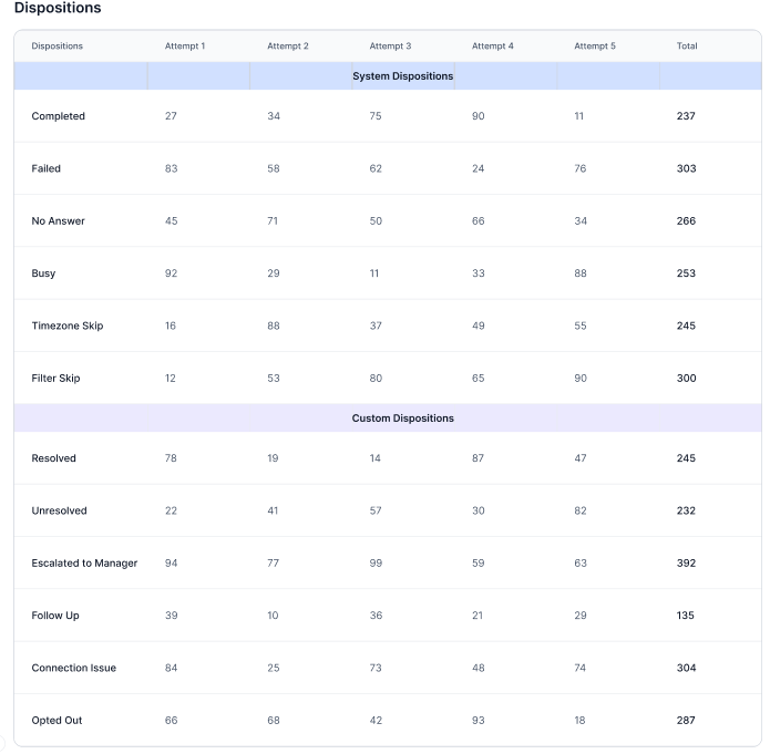 The Dispositions vs. Attempts table shows how each outbound attempt is recorded against its final status. As a conversation moves through multiple attempts, the system counts only the latest outcome and maps it to the corresponding disposition–attempt combination.