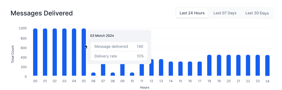 Hovering over the hours/days shows the count of messages delivered and the delivery rate.