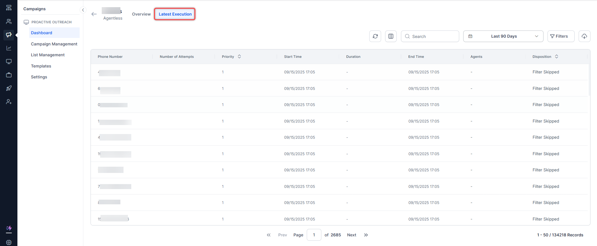The Latest Execution view provides a consolidated list of all calls executed in the most recent campaign run. The view displays each call as a conversation entry and includes selectable fields, filtering options, and export capabilities.