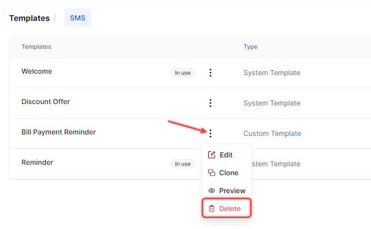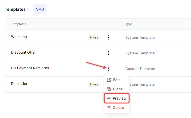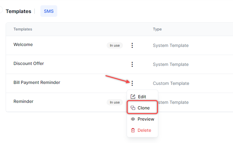 - Custom Templates: Edit, Clone, Preview, and Delete.