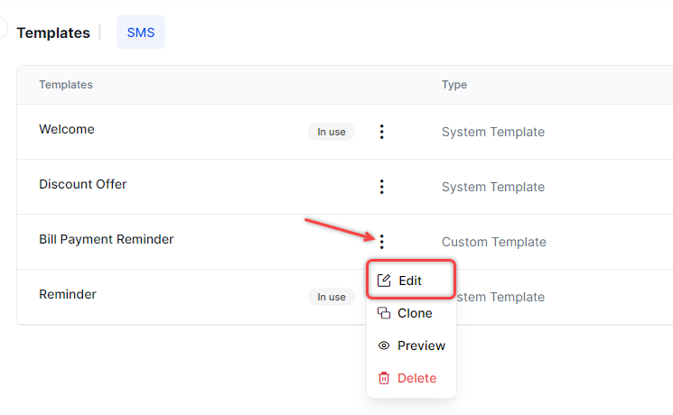 Click the Ellipsis (︙) icon beside the custom template name and click Edit.