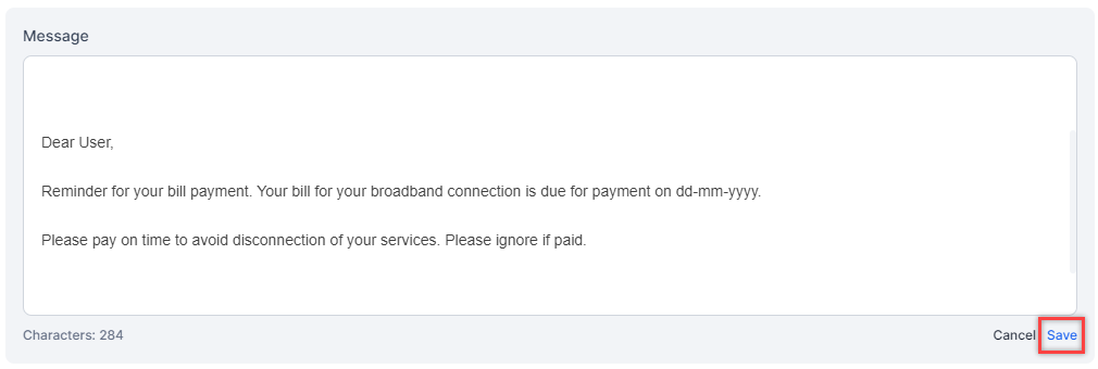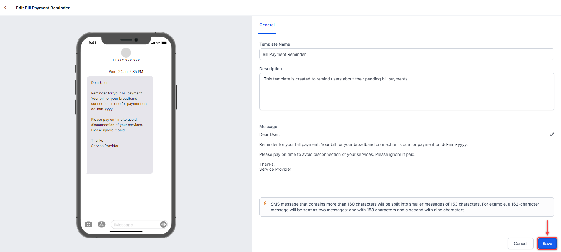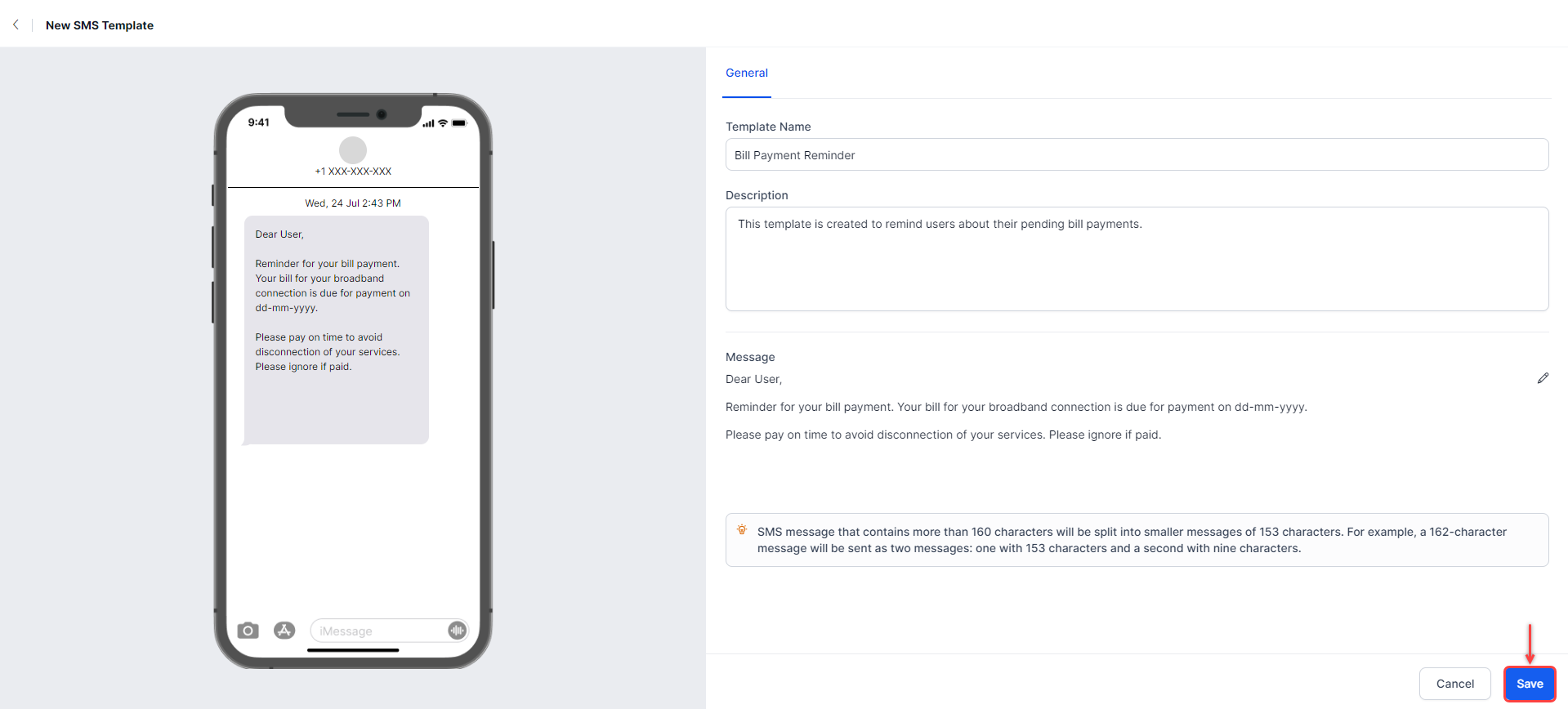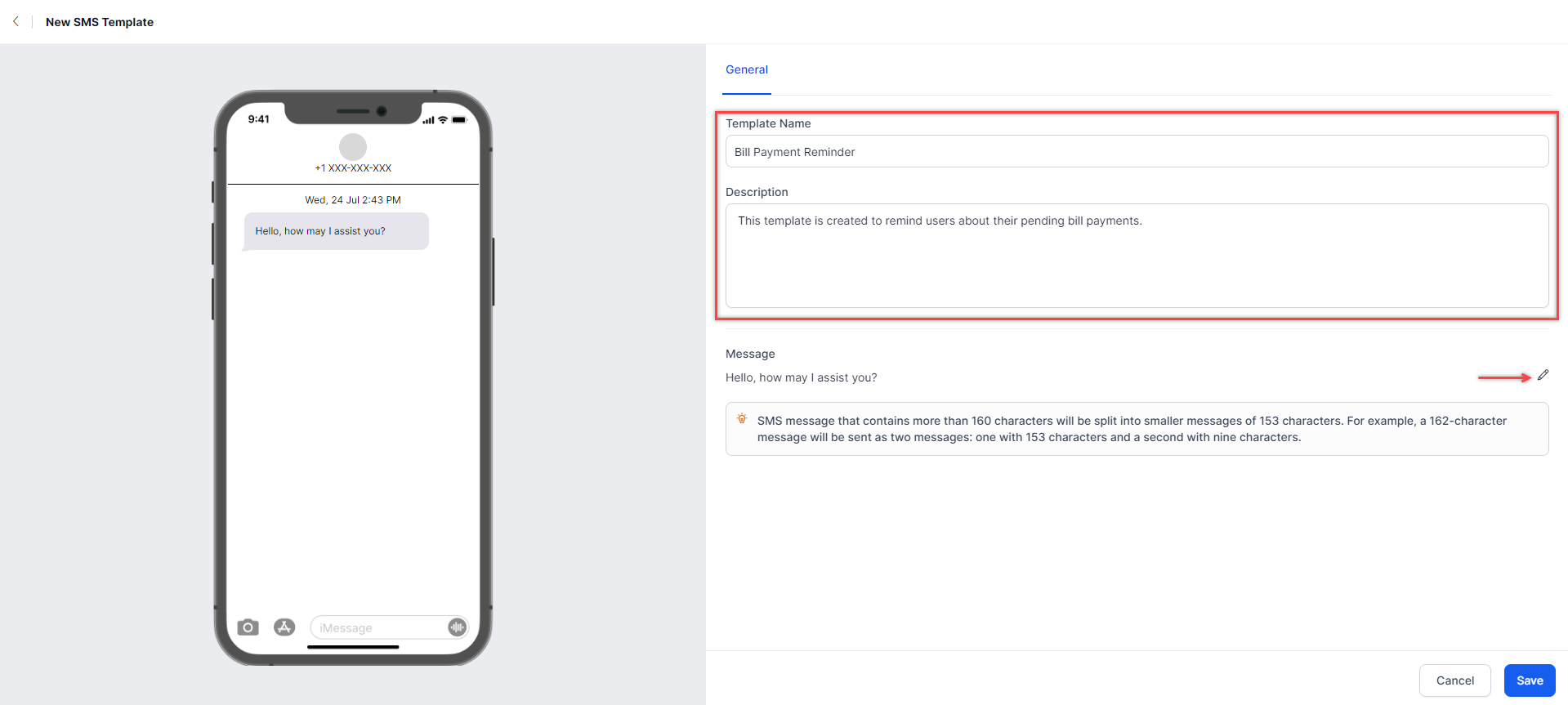 On the New SMS Template page, enter the Template Name, and Description, and then click the 🖉 icon to enter the message.