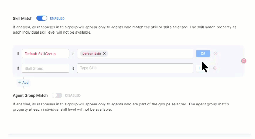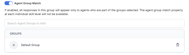 Agent Group Match – This option is disabled by default. When enabled, all the responses in this group appear only to member agents. The agent group matching property at each skill level is not available.