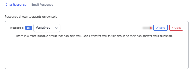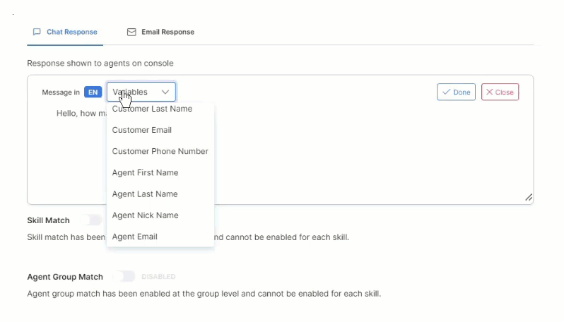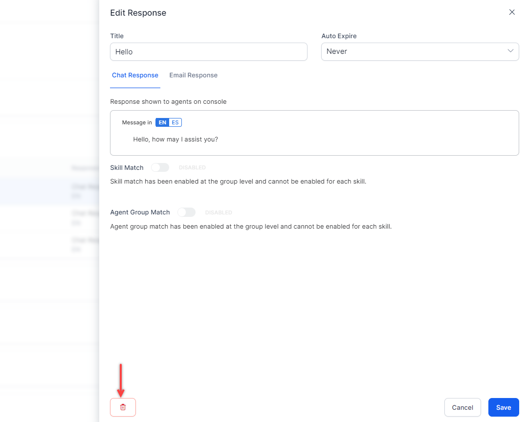 Skill Match – By default, this feature is disabled. While Skill Match is off at the group level, you can map skills per response. If you enable this feature, all the responses in this group will be mapped to the selected skills and made available to matching agents. Therefore, the group and its responses within it will not be made available to agents who are not assigned the mapped skills. The skill match does not take routing into account, so if an agent matches the skills but, for example, is transferred a conversation from an agent with a different skill set, they will still see the responses.