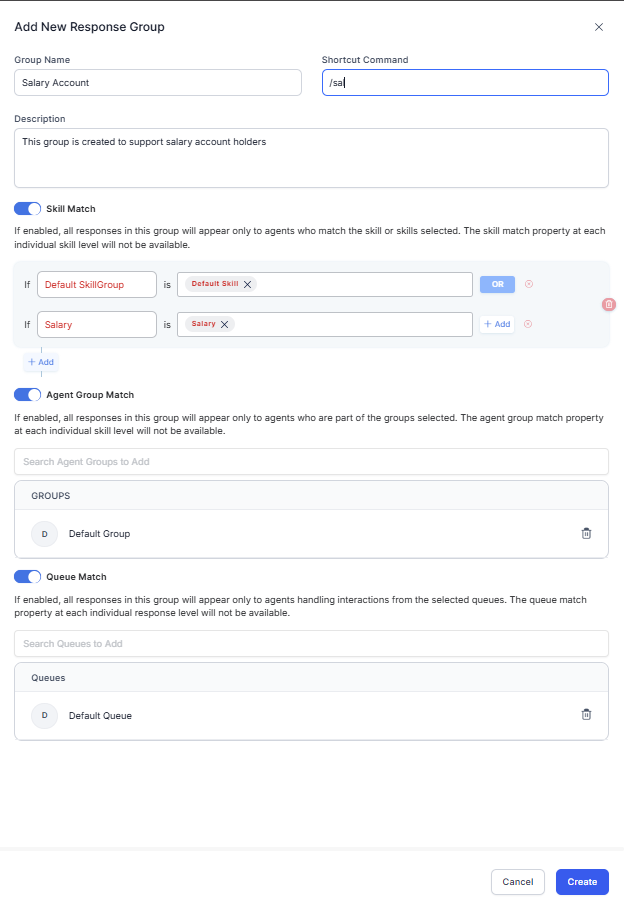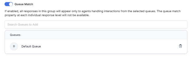 Queue Match - When Queue Match is enabled, administrators can select one or more queues from a dropdown, and the response group becomes visible only to agents handling interactions from those queues.