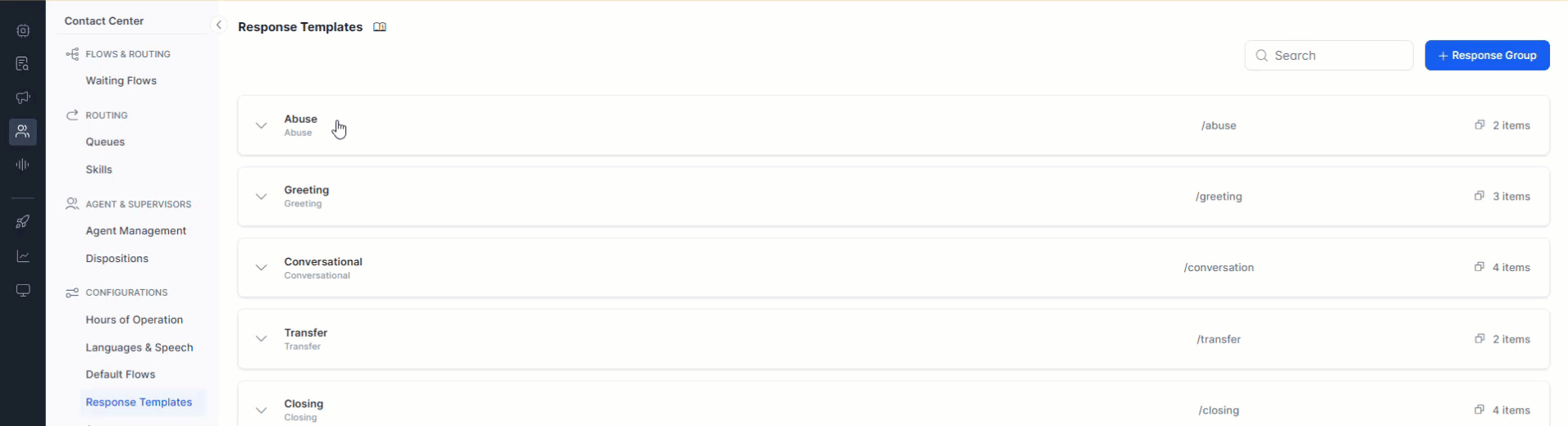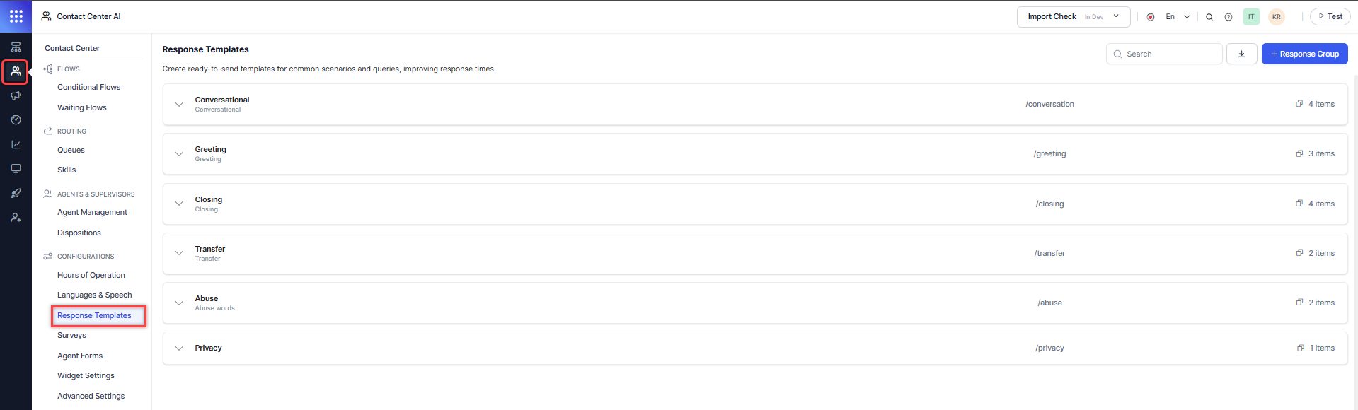 To access this feature, go to Contact Center AI > CONFIGURATIONS > Response Templates.